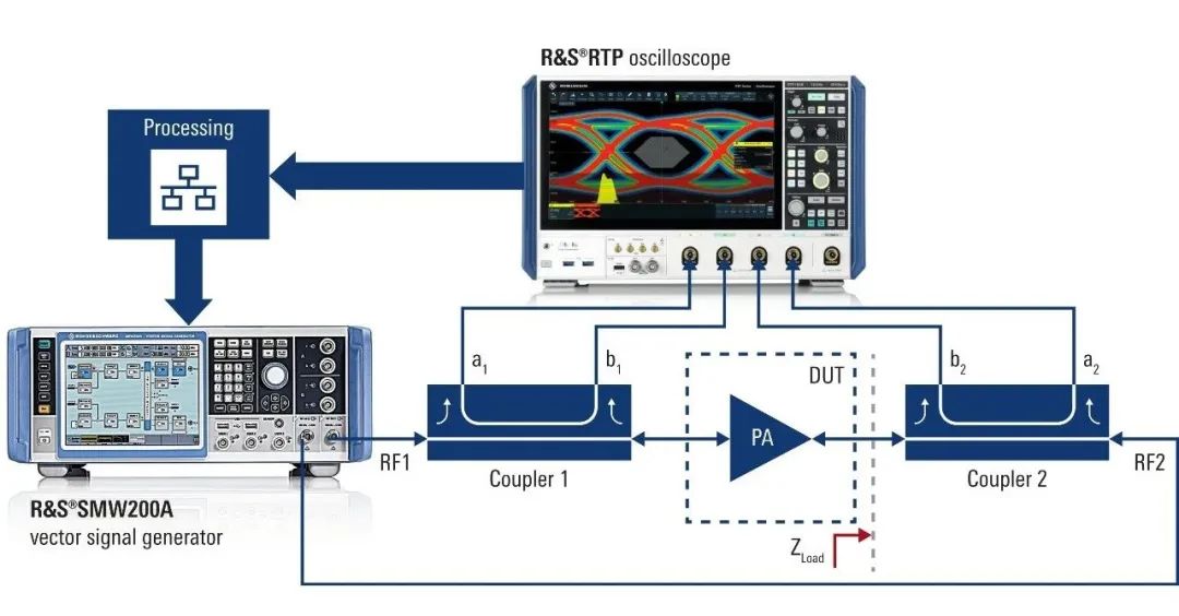 圖:基于 R&S RTP 示波器和 R&S SMW200A 矢量信號發(fā)生器的新型寬帶調(diào)制負載牽引解決方案