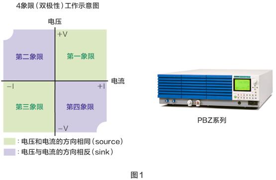作為菊水的雙極性電源PBZ系列,無需切換輸出端子正負極性即可連續(xù)通過0點,實現(xiàn)正負極雙向可變。PBZ系列采用4象限工作支持方式(如下圖),不僅可以提供功率(source),也可以像電子負載那樣吸收功率(sink)。