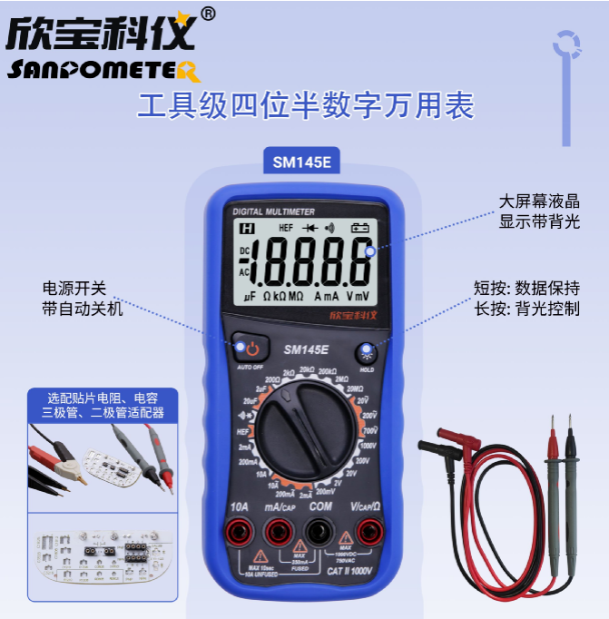 欣寶科儀SM145E數(shù)字萬用表是一款工具級四位半數(shù)字萬用表。這款產(chǎn)品號稱“一款資深電子工程師為自己打造的工具表”。是欣寶科儀品牌創(chuàng)始人趙鐵軍先生基于其30年的產(chǎn)品研發(fā)經(jīng)驗潛心研發(fā)出來的產(chǎn)品,以四位半、更高精度的數(shù)字萬用表代替三位半數(shù)字萬用表的使用場景,解決了工程師們使用這類工具時存在的一些痛點問題。