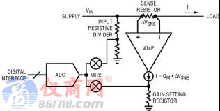 為了測(cè)量電流,需要在電源通路中放置一個(gè)檢測(cè)電阻器,再測(cè)量其壓降。如圖 1 所示,跨導(dǎo)放大器將高壓側(cè)檢測(cè)電壓轉(zhuǎn)換成電流輸出,該電流流經(jīng)增益設(shè)定電阻器,以產(chǎn)生一個(gè)以地為基準(zhǔn)并與負(fù)載電流成比例以及適合饋送給 ADC 的電壓。