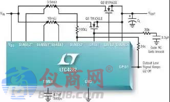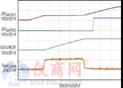 此外,LTC4282 的雙電流路徑還用于使 MOSFET SOA 要求與導(dǎo)通電阻脫鉤。大的 SOA 對(duì)于啟動(dòng)浪涌、電流限制和輸入電壓階躍等具有巨大應(yīng)力的情況是很重要的。當(dāng) MOSFET 柵極完全接通時(shí),低的導(dǎo)通電阻可降低正常操作期間的電壓降和功率損耗。不過(guò),這些是存在沖突的要求,因?yàn)?MOSFET SOA 通常隨著導(dǎo)通電阻的改善而變差。LTC4282 允許采用一條具有一個(gè)能處理應(yīng)力情況之 MOSFET 的路徑,和另一條具有低導(dǎo)通電阻 MOSFET 的路徑。這被稱(chēng)為一種分級(jí)起動(dòng)配置。
