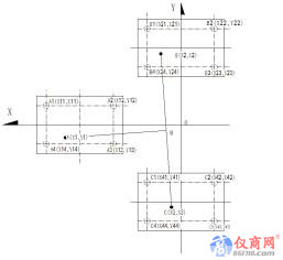 以三點式飛機(jī)重量重心測量系統(tǒng)為例(見圖1),對飛機(jī)機(jī)輪輪距的測量進(jìn)行說明,取飛機(jī)稱重秤臺平面二維坐標(biāo)系(見圖2),可以將該坐標(biāo)系與飛機(jī)稱重系統(tǒng)所用的坐標(biāo)系在水平平面的二維投影很容易進(jìn)行變換,保證了飛機(jī)重量重心測量系統(tǒng)與飛機(jī)機(jī)輪輪距測量軟件的融合創(chuàng)造了條件。