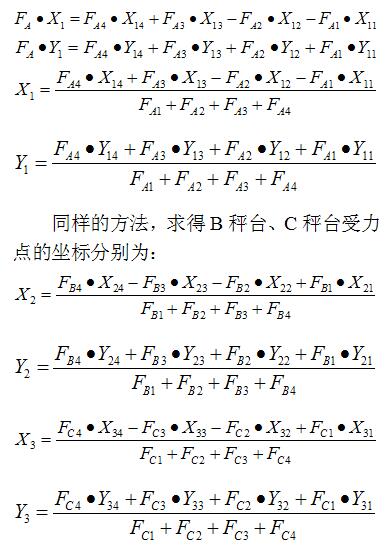 假設(shè)A秤臺飛機(jī)機(jī)輪施加的力值為FA,坐標(biāo)為A(X1,Y1),四只傳感器的受力分別為FAi(i=1,2,3,4),坐標(biāo)分別為Ai(X1i,Y1i)(i=1,2,3,4);B秤臺飛機(jī)機(jī)輪施加的力值為FB,坐標(biāo)為B(X2,Y2),四只傳感器的受力分別為FBi(i=1,2,3,4),坐標(biāo)分別為Bi(X2i,Y2i)(i=1,2,3,4);C秤臺飛機(jī)機(jī)輪施加的力值為FC,坐標(biāo)為C(X3,Y3),四只傳感器的受力分別為FCi(i=1,2,3,4),坐標(biāo)分別為Ci(X3i,Y3i)(i=1,2,3,4);對于A秤臺,以靜力平衡原理得: