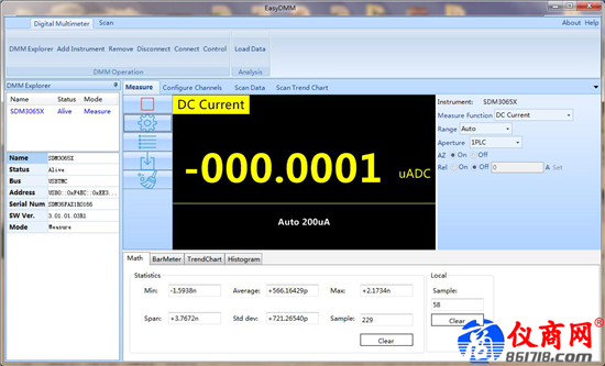 在測(cè)試過(guò)程中,我們使用了SDM3065X特有的EasyDMM上位機(jī)軟件,集成了數(shù)據(jù)分析,保存的功能,圖形化的顯示操作界面,相對(duì)于在萬(wàn)用表端進(jìn)行操作,PC端操作更加實(shí)用和簡(jiǎn)便。