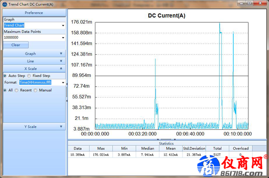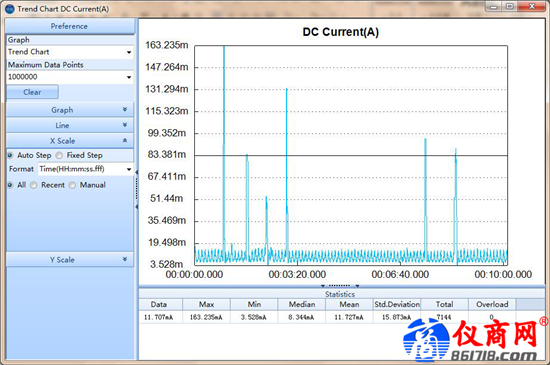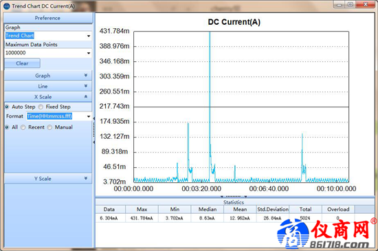 我們?cè)谶M(jìn)行息屏待機(jī)這樣長(zhǎng)時(shí)間的測(cè)量時(shí),使用了萬(wàn)用表的測(cè)量統(tǒng)計(jì)功能,由下方的統(tǒng)計(jì)表格可以直接看到平均電流為12.952mA,峰值431.784mA,最小值為3.702mA。同時(shí)選擇打開(kāi)趨勢(shì)圖,看到在整個(gè)10分鐘的測(cè)量區(qū)間內(nèi)電流變化情況,能夠很明顯的觀察到偶爾跳出的異常電流。
