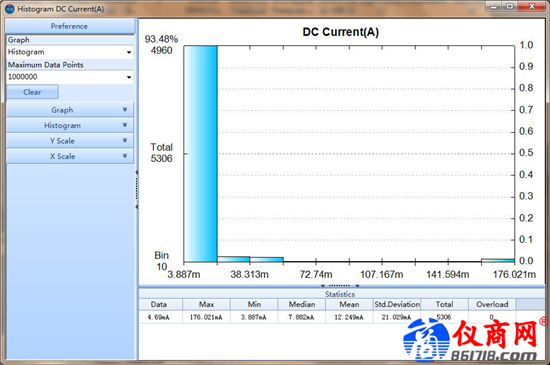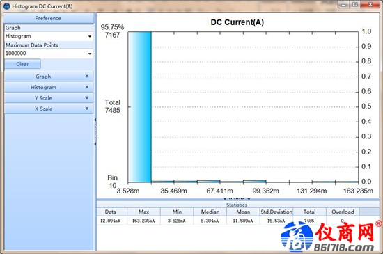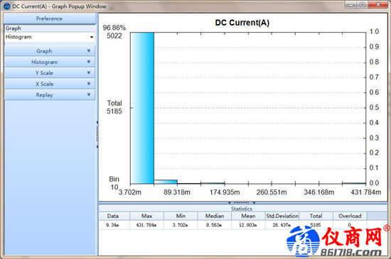 測(cè)量結(jié)束后我們對(duì)數(shù)據(jù)選擇直方圖顯示模式,對(duì)整個(gè)待機(jī)區(qū)間內(nèi)測(cè)量到的電流情況進(jìn)行分析,輸出電流值百分比,可以看到3.702至40mA左右的數(shù)據(jù)在10分鐘測(cè)量數(shù)據(jù)中占到了96.86%,這個(gè)功能讓數(shù)據(jù)分析變得很方便。