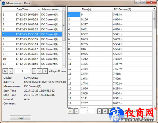 可以通過(guò)”Graph”按鍵將任意保存的數(shù)據(jù)進(jìn)行趨勢(shì)圖和直方圖分析,還可以通過(guò)“Export”按鍵將數(shù)據(jù)導(dǎo)出為CSV文件格式,這是兩個(gè)很實(shí)用的功能。