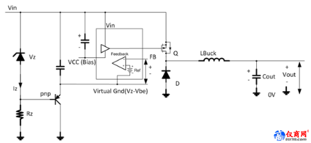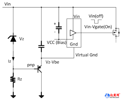 如何為控制器創(chuàng)建懸浮接地?這很簡單,通過使用射極跟隨器即可實現(xiàn)。圖3所示為這種方案的基本實踐。PNP發(fā)射極的電位為Vbe(~0.7V),低于齊納二極管電壓電位(Vz)。實質(zhì)上,您可以將控制器浮動到VIN,并調(diào)節(jié)控制器的參考值,以限制VIN與器件接地之間的電壓。