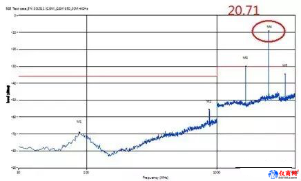 首先,針對三次諧波分析雜散輻射來源是否通過傳導(dǎo)傳播,通過測試驗證此頻率下傳導(dǎo)雜訊的裕量在9dB以上。接下來的思路轉(zhuǎn)移到了輻射的雜訊上。