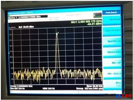 針對輻射問題,我們要尋找出干擾的噪聲,使用頻譜分析儀在頻域分析會更快速精準(zhǔn)的找出方案。這里我們使用性價比較高的CXA N9000A頻譜分析儀,搭配使用N9311X 套件中的磁場環(huán)形探針來掃描手機的近場雜訊。通過使用較低靈敏度的環(huán)形探頭可以發(fā)現(xiàn)在天線區(qū)域存在較大的諧波,如圖3所示 2.55GHz峰值達(dá)到了 -43.29dBm。