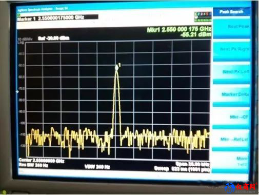 從測試結(jié)果來看,諧波超標(biāo)很嚴(yán)重,這一點與天線區(qū)域的雜訊信號很相似,考慮到傳導(dǎo)嫌疑已經(jīng)排除,因此分析的重點集中到了天線區(qū)域的非線性器件。從如圖4所示原理圖可以看出,天線的調(diào)諧開關(guān)是正常工作的,由于天線開關(guān)本身是非線性器件,因此首先確認(rèn)天線開關(guān)的影響。將天線開關(guān)旁路(天線仍然正常)如圖5所示,發(fā)現(xiàn)此時2.55GHz的雜訊可以降低到-55.7dBm左右,因此可以確定天線區(qū)域的雜訊就是調(diào)諧開關(guān)造成的。
