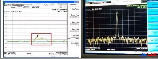 圖7  調(diào)試前750MHz及2.25GHz近場輻射測試結(jié)果