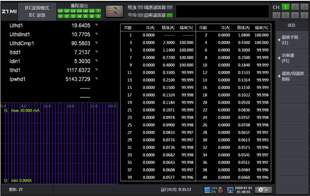 IEC諧波測量:按照 IEC61000-4-7 標(biāo)準(zhǔn)執(zhí)行諧波測量,使用此模式可以檢查家用電器和辦公自動化設(shè)備的諧波是否符合 IEC 標(biāo)準(zhǔn),如圖5所示,為IEC諧波測試。