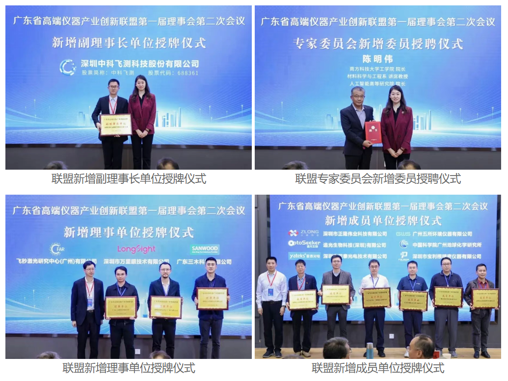 另外,還專(zhuān)門(mén)為聯(lián)盟新增副理事長(zhǎng)單位深圳中科飛測(cè)科技股份有限公司,理事單位深圳市萬(wàn)里眼技術(shù)有限公司、飛秒激光研究中心(廣州)有限公司、廣東三木科技有限公司,以及深圳市正隆偉業(yè)科技有限公司等六家成員單位進(jìn)行了授牌。并且為聯(lián)盟新增專(zhuān)家委員會(huì)委員陳明偉院長(zhǎng)頒發(fā)聘書(shū),進(jìn)一步壯大了聯(lián)盟成員單位及專(zhuān)家力量。