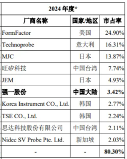當前,全球探針卡市場主要被國外廠商壟斷。數(shù)據(jù)顯示,美國廠商FormFactor以24.9%的市場份額位居全球第一,意大利廠商Technoprobe以16.31%的市占率緊隨其后,日本廠商MJC以13.87%的份額排名第三。這三家企業(yè)合計市場占有率超過55%,長期占據(jù)全球探針卡市場前三甲位置。