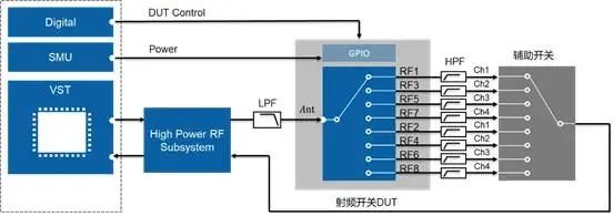 在量產(chǎn)測試中,信號分析儀相對較高,因此依然可以使用矢量信號收發(fā)儀搭配高功率模塊來實(shí)現(xiàn), 大化復(fù)用之前測試項(xiàng)所使用的儀器。