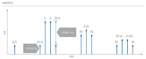 三階失真描述的是一階基音信號和每個(gè)二階失真產(chǎn)物之間的相互作用。事實(shí)上,通過數(shù)學(xué)計(jì)算,可以看到兩個(gè)特定的三階失真出現(xiàn)在接近基音頻率的頻率下。以一個(gè)實(shí)際應(yīng)用為例,當(dāng)DUT發(fā)送調(diào)制信號時(shí),三階失真作為帶內(nèi)失真出現(xiàn)在鄰近感興趣頻帶的地方。