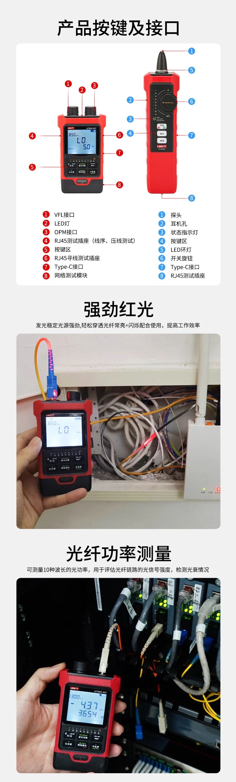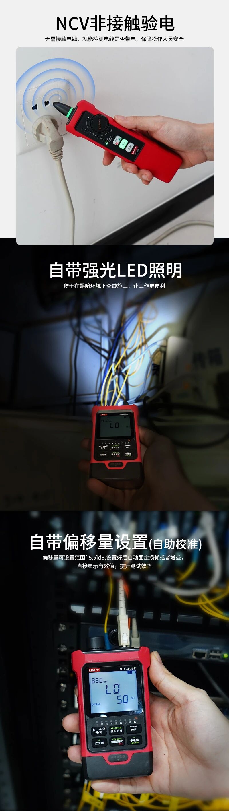 在現(xiàn)代通信與網(wǎng)絡維護工作中,工程師和技術人員往往需要攜帶多種工具,來應對光纖與銅纜的安裝、調試及故障排查。優(yōu)利德推出的UT698系列七合一光功尋線儀,將光功率測量、紅光尋斷點、NCV檢測、網(wǎng)線尋線、網(wǎng)絡對線、水晶頭壓接檢測以及手電筒七大核心功能融合于一身,大大簡化了現(xiàn)場操作流程,提升了工作效率,真正實現(xiàn)“一機在手,網(wǎng)絡無憂”。