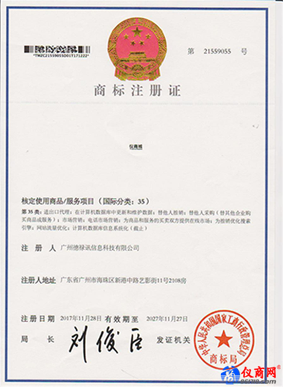 近期,廣州德祿訊信息科技有限公司獲得國家商標總局核準注冊并頒布的《儀商城》商標證書,這標志著《儀商城》https://www.yishangm.com/正式進入品牌化高速發(fā)展的新里程?!秲x商城》商標的成功注冊,是儀商全媒體電子商務(wù)平臺戰(zhàn)略中,具有重要意義的一步。